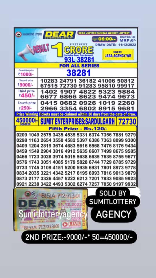 सरदूलगढ़ स्थित सुमित लॉटरी एजेंसी से 11/12/2022 बिकी डियर कंपनी की 6 रुपए वाली लॉटरी का रात 6:00 बजे वाले ड्रा में 9000 के 50 (साढ़े चार लाख) का इनाम लगा। काउंटर के मालिक सुमित ने बताया कि आज शाम ही सरदूलगढ़ में स्थित काउंटर से नागालैंड स्टेट की डिअर कंपनी की 6 रुपये वाली टिकट नंबर 72730 का 50 टिकट का सेट ग्राहक को बेचा था।शाम जब 6 बजे रिजल्ट आया तो पता चला कि ग्राहक को साढ़े चार लाख का इनाम लगा है।सुमित ने बताया कि कुछ दिन पहले भी उनकी लॉटरी एजेंसी के इस काउंटर से 5/12/2022 को 9 लाख का इनाम लगा था। और आज फिर साढ़े चार लाख का एक और इनाम लग गया।सुमित ने कहा कि भविष्य में लॉटरी डालने के लिए ग्राहक 89688 69862 पर कॉल अथवा व्हाट्सएप्प के जरिये सम्पर्क करें।